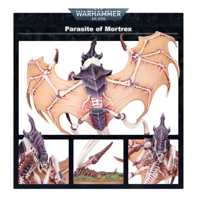 Ce kit permet d'assembler un Parasite de Mortrex. Armée de membres griffus et d'un ovipositeur acéré, cette bête ailée est un organisme d'incubation mobile abritant des centaines de graines de Voraces. Doté de nombreuses aptitudes, ce biomorphe unique ajoute des options tactiques perturbatrices aux vrilles déjà imprévisibles des Flottes-ruchest.