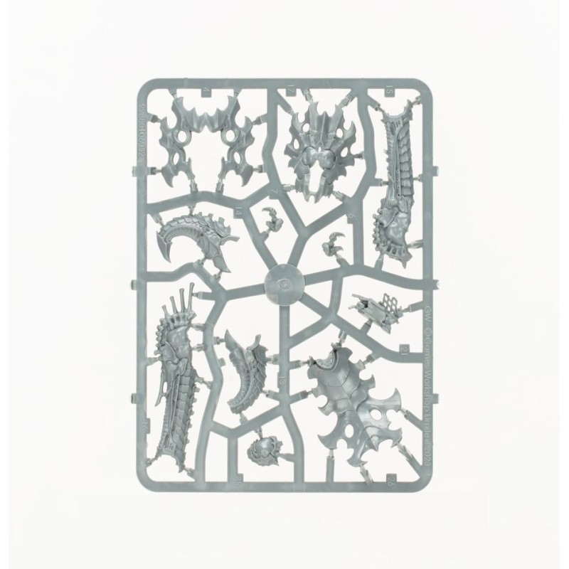 Les Gardes Tyranides peuvent être armés de pinces broyeuses, de griffes tranchantes, ou d'un hachoir d'os et d'un bioknout. Les têtes, corps, queues, jambes, bras et armes sont interchangeables entre toutes les figurines, ce qui vous permet de déchaîner votre Esprit-ruche profond au moment de les assembler. Ils peuvent autrement être assemblés comme des Gardes des Ruches, armés au choix d'un canon empaleur ou d'un canon choc.