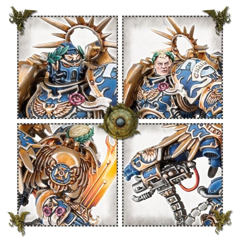 Ce kit plastique contient les composants nécessaires pour assembler Roboute Guilliman, Primarch des Ultramarines. Sujet à la stature imposante, il dépasse les Space Marines Primaris de deux têtes, il regorge de détails – l'Armure du Destin qui le protège est ornée de toutes parts de dorures sculptées, d'aquilæ, de sceaux de pureté, de crânes et d'icônes du Chapitre des Ultramarines. Son paquetage dorsal ailé arbore une plaque avec la marque de fabrique de l'Adeptus Mechanicus, plus un majestueux halo de fer, et de nombreux câbles le rattachent aux armes qu'il alimente. L'Épée de l'Empereur qu'il manie de la main droite brûle de la fureur du juste (au sens propre), tandis que la Main de Domination, son gantelet gauche massif, peut également tirer des projectiles perforants. On peut au choix représenter Guilliman tête nue, ou avec un heaume à l'aspect résolument agressif – dans les deux cas il a une couronne de lauriers.