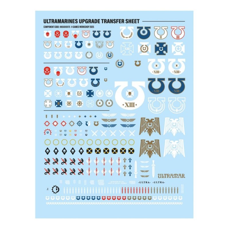 – 1x Planche de Décalcos des Ultramarines, proposant 255 décalcos de grande qualité. Elle comporte des icônes de Chapitre des Ultramarines, des symboles de rôle tactique, des badges de campagne, des chiffres et des marquages honorifiques, ainsi que de plus grandes décalcos pour décorer les véhicules.