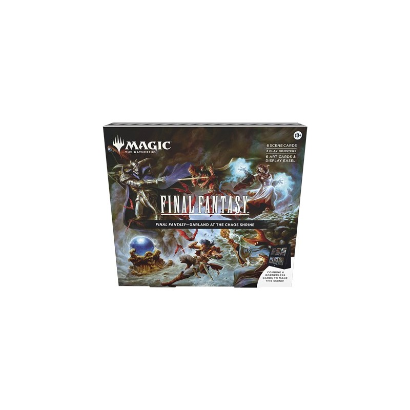 Description du produitCette boîte scénique Magic: The Gathering—FINAL FANTASY contient 6 cartes scéniques sans bordure Premium traditionnelles, 6 cartes d’illustration, 3 boosters de jeu et un chevalet de présentation en papier. Chaque booster de jeu contient 14 cartes Magic: The Gathering, avec 1 à 4 cartes de rareté rare ou supérieure, 3 à 6 cartes inhabituelles, 6 à 9 cartes courantes et 1 carte de terrain. Une carte de n’importe quelle rareté est Premium traditionnelle. La carte de terrain est aussi Premium traditionnelle dans 20 % de boosters. Ce produit ne contient pas de carte Chocobo doré (disponible uniquement dans les boosters collector en anglais).
