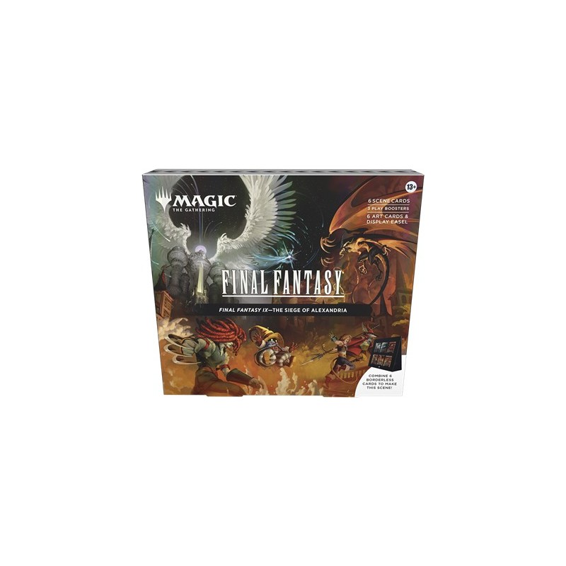 Description du produitCette boîte scénique Magic: The Gathering—FINAL FANTASY contient 6 cartes scéniques sans bordure Premium traditionnelles, 6 cartes d’illustration, 3 boosters de jeu et un chevalet de présentation en papier. Chaque booster de jeu contient 14 cartes Magic: The Gathering, avec 1 à 4 cartes de rareté rare ou supérieure, 3 à 6 cartes inhabituelles, 6 à 9 cartes courantes et 1 carte de terrain. Une carte de n’importe quelle rareté est Premium traditionnelle. La carte de terrain est aussi Premium traditionnelle dans 20 % de boosters. Ce produit ne contient pas de carte Chocobo doré (disponible uniquement dans les boosters collector en anglais).