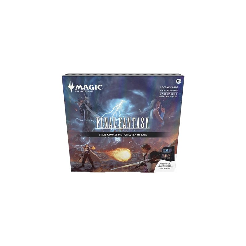Description du produitCette boîte scénique Magic: The Gathering—FINAL FANTASY contient 6 cartes scéniques sans bordure Premium traditionnelles, 6 cartes d’illustration, 3 boosters de jeu et un chevalet de présentation en papier. Chaque booster de jeu contient 14 cartes Magic: The Gathering, avec 1 à 4 cartes de rareté rare ou supérieure, 3 à 6 cartes inhabituelles, 6 à 9 cartes courantes et 1 carte de terrain. Une carte de n’importe quelle rareté est Premium traditionnelle. La carte de terrain est aussi Premium traditionnelle dans 20 % de boosters. Ce produit ne contient pas de carte Chocobo doré (disponible uniquement dans les boosters collector en anglais).