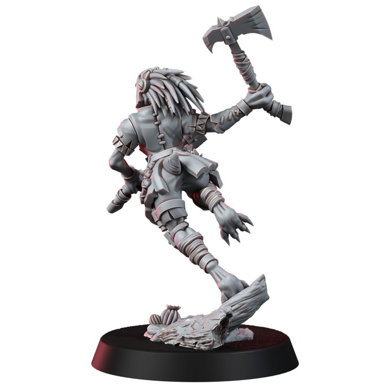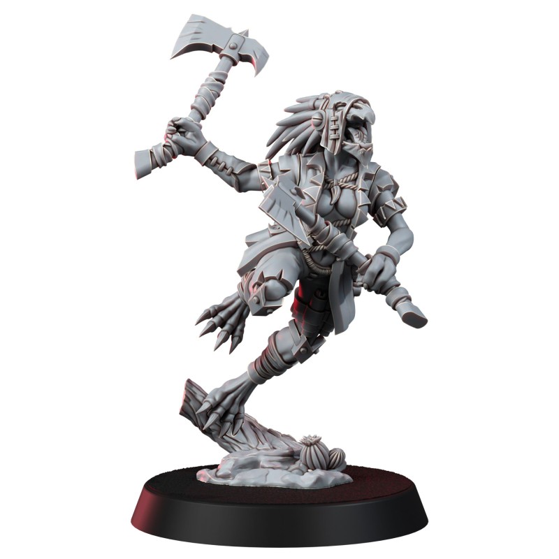 Autrefois simple guerrière au sein des sauvages clans kroolls, elle est entrée dans la légende en maîtrisant l'art sacré des Lames jumelles de Qarrl - des haches acérées comme des rasoirs, réputées pour trancher non seulement la chair, mais aussi la volonté même de ses ennemis. À force de combats acharnés, elle a gagné son titre et est devenue la Bloodtaker, un chef de guerre redouté du chapitre de combat des Kroolls. Sa vitesse fulgurante et sa furtivité mortelle font d'elle un prédateur hors pair, et lorsqu'elle frappe, c'est avec une précision affinée à la fois par un instinct brutal et une maîtrise disciplinée.