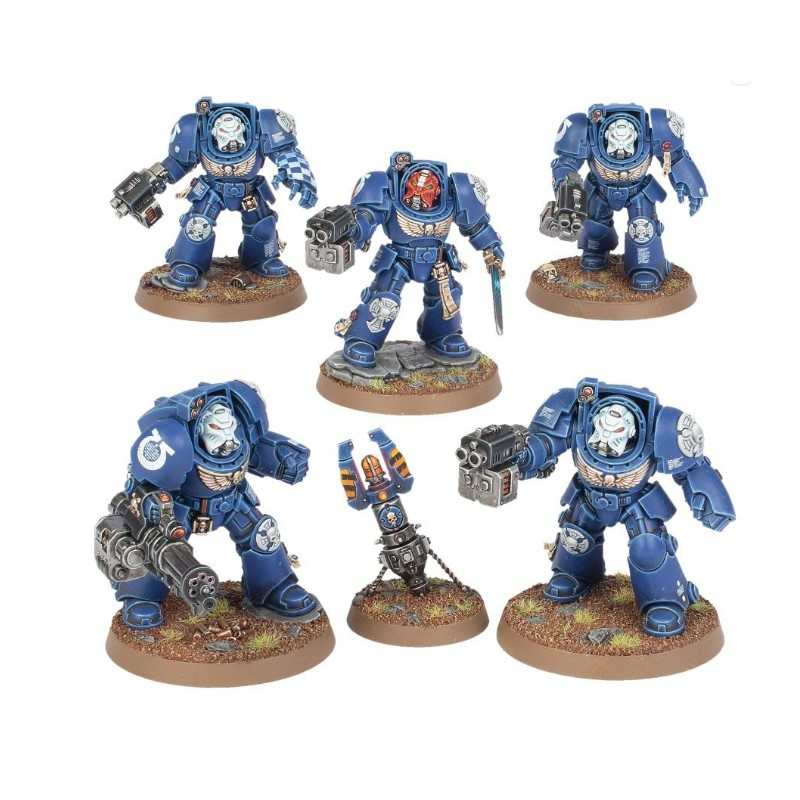 - 5x Terminators: Des guerriers vétérans engoncés dans des armures quasi impénétrables et équipés d'armes lourdes