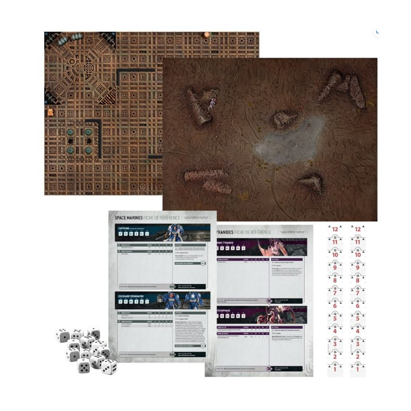 - Contient les règles de base du jeu, ainsi que des dés, un tapis de jeu, des fiches de référence et des règles graduées