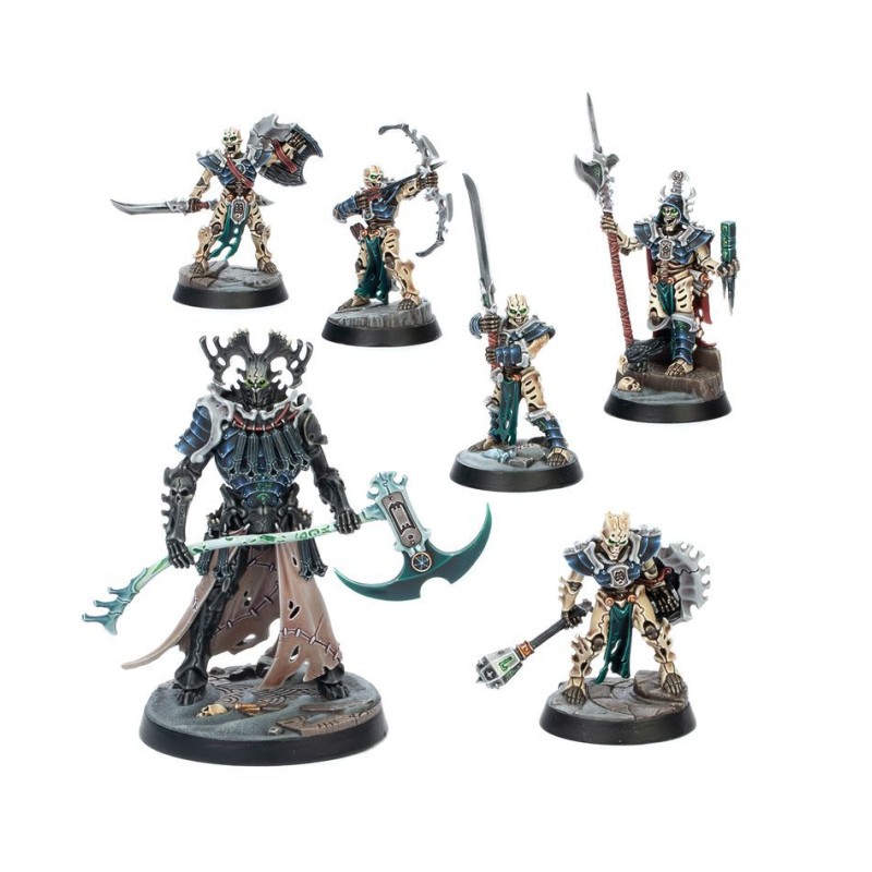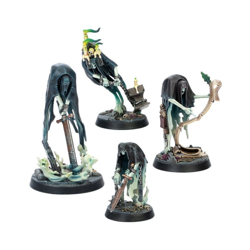 Ce kit rassemble quatre bandes sur le thème de la Mort pour Warhammer Underworlds. Toutes les figurines sont à emboîter, moulées en plastique coloré, et intègrent des socles scéniques afin que vous puissiez rapidement commencer à jouer. Vous y trouverez également des cartes de charte et des cartes de combattant pour chaque bande. Les Collecteurs de Kainan et la Cour Écarlate sont deux bandes Polyvalentes, la Malédiction du Bourreau est une bande de Frappe agressive, et le Sombreguet est une robuste bande de style Prendre et Tenir.