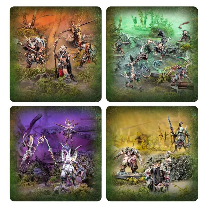Ce kit rassemble quatre bandes sur le thème du Chaos pour Warhammer Underworlds. Toutes les figurines sont à emboîter, moulées en plastique coloré, et intègrent des socles scéniques afin que vous puissiez rapidement commencer à jouer. Vous y trouverez également des cartes de charte et des cartes de combattant pour chaque bande. La Meute de l'Âme Noueuse est une bande Polyvalente, la Meutegriffe de Skittershank est une bande de Frappe agressive, la Triple Discorde et les Verructés offrent un style de jeu de Maîtrise, qui récompense une gestion minutieuse.
