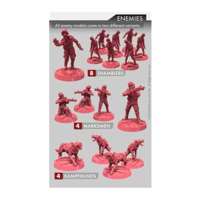 Wolfenstein : The Old Blood offre aux joueurs quatre nouveaux scénarios qui constituent une campagne préquelle fermée avec cinq nouvelles cartes de héros (et figurines) et la possibilité de contrôler votre propre Mech. Il comprend deux nouveaux boss (The Monstrosity et Rudi Jäger) et trois nouveaux types d'ennemis qui se déclinent chacun en deux variantes différentes.