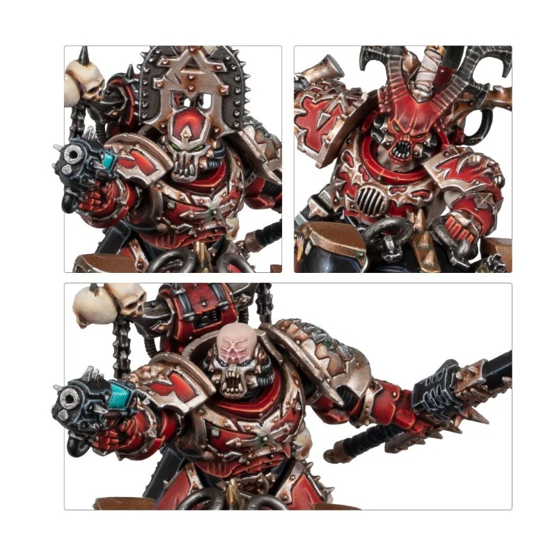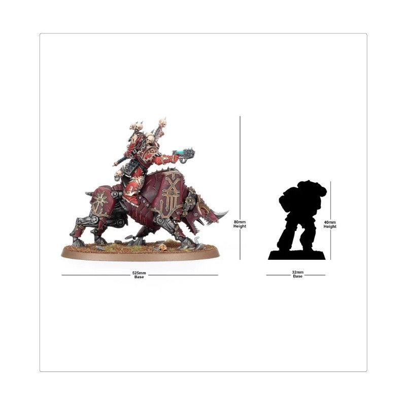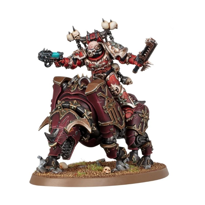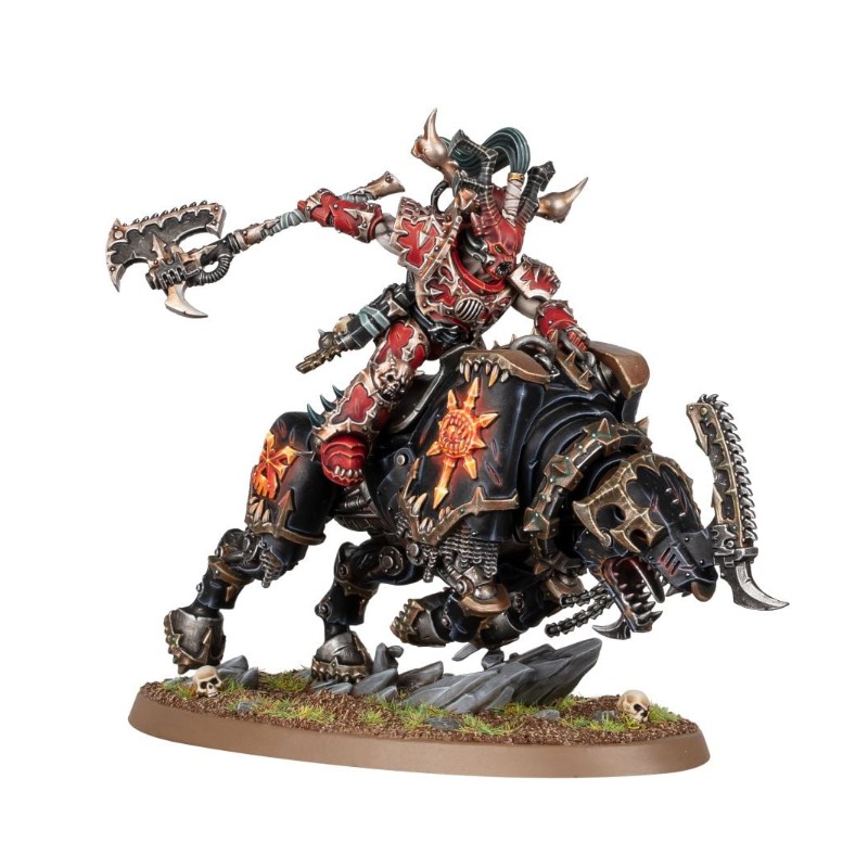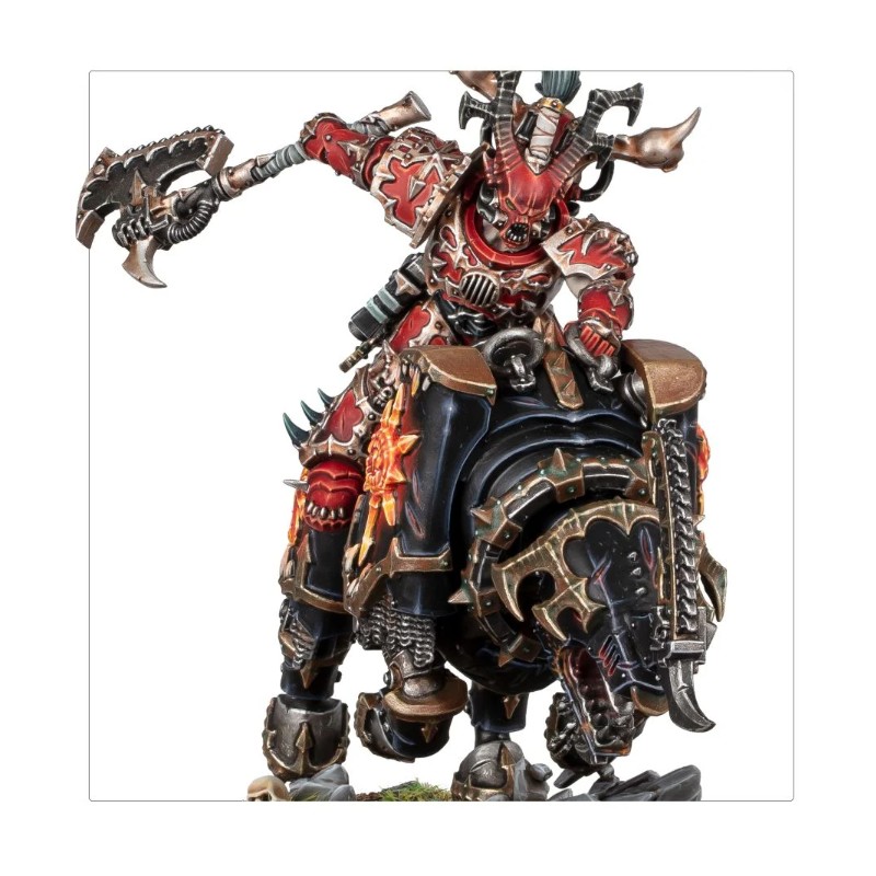 - Se rend au combat sur le dos d'une monture démon de Khorne, armé d'une lame tronçonneuse et d'un pistolet à plasma